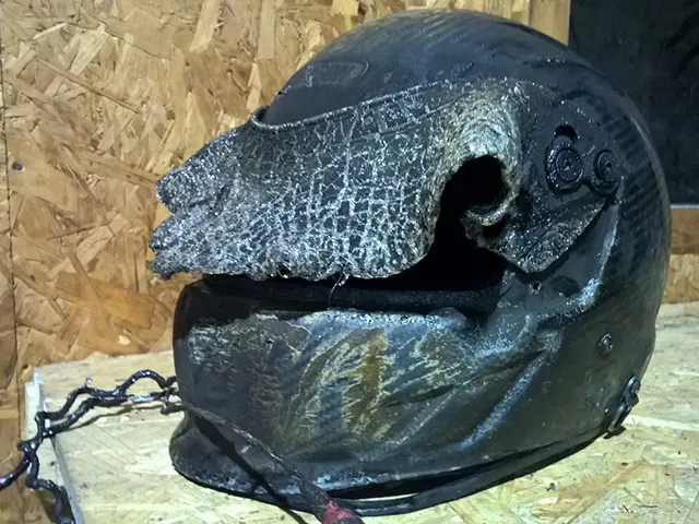 What remains of Lyle’s carbon fiber helmet. This photo clearly shows the intense heat Lyle battled inside the car as he tried to bring it to a stop.
