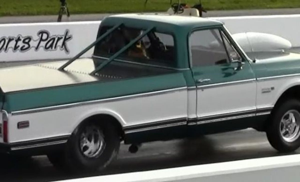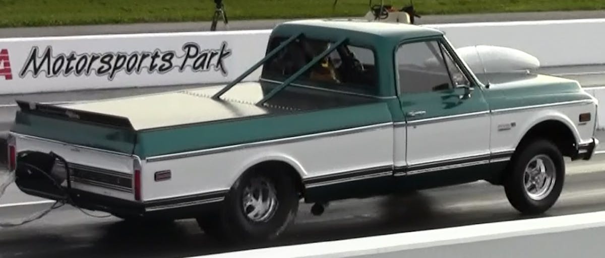 A ’71 Cheyenne has all the aerodynamics of a block wall, so, the next question is what power adders are used. Must be twin turbos, right? Wrong. It’s a 632ci V-8 with a small 150hp shot of nitrous oxide. The video shows the green and white pickup running a 5.55 eighth mile elapsed time and charging on to cross the quarter mile mark in 8.56 seconds all at 160 miles per hour. Although the eight foot bed on the truck adds weight, the extra wheel base provides traction and allows for a nice straight ride even at that speed.