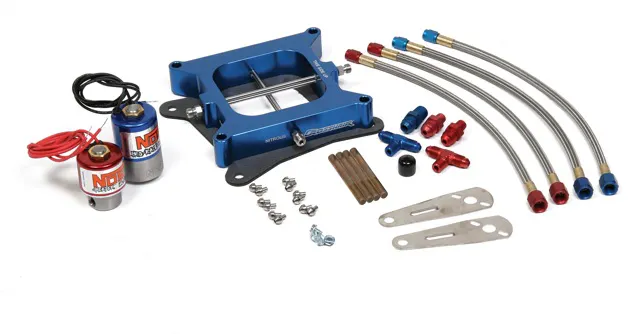 Bill also showed off NOS’s new CrossHair™ carbureted nitrous plate kits. They’re available for standard square flange carbs (P/N 02153NOS) and Dominator® flange carbs (P/N 02154NOS). The new CrossHair systems were developed with the serious racer in mind and are capable of adding 350+ additional horsepower. “Double Down” spray bars are crisscrossed in the plate to deliver a wide spray pattern plus improve the distribution and atomization of the fuel and nitrous. Fuel is delivered at a 37 degree angle while the nitrous is delivered at a 35 degree angle sheering the fuel for improved atomization. This spray pattern makes it a good choice for all intake designs.