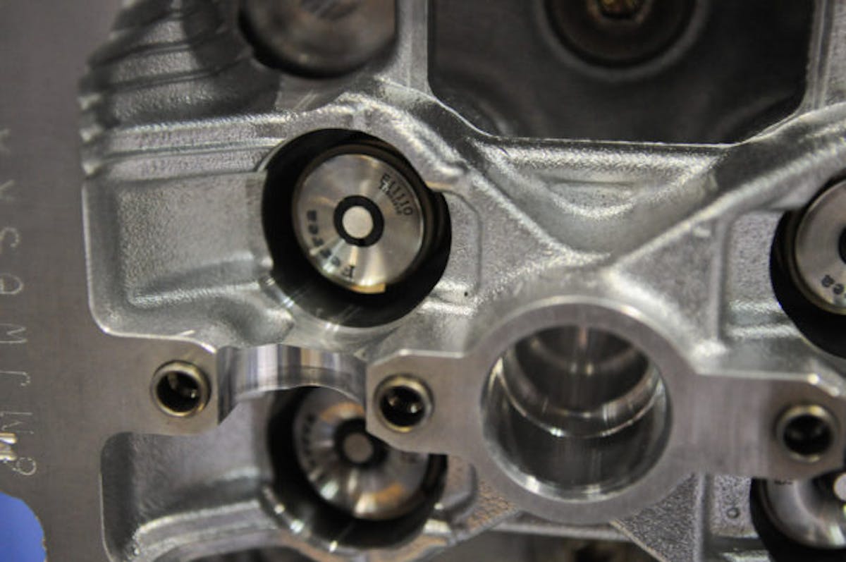 The single spring approach utilizes a titanium retainer and steel spring seat locators with a black oxide makeup, and 4140 chromoly steel valve locks. Both the single and dual valve spring setups are made from a super clean pacalloy material.  The micropolished Competition Plus and standard-sized valves maintain the OEM design of the GT-R valves, which features a thicker stem for durability in coping with the boost delivered from the GT-R’s factory turbocharger setup.