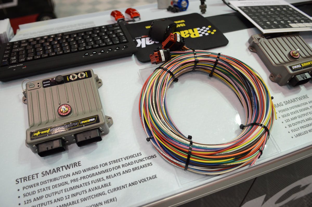 Here at PRI, Racepak has some of their latest and most popular Smartwire power control modules on display, which are power distribution units for the chassis, sporting 125 amps of output and featuring 30 outputs and 12 inputs. The company debuted their Drag Smartwire and Street Smartwire last year, but since that time have completed and launched their wiring harnesses to pair with the modules.