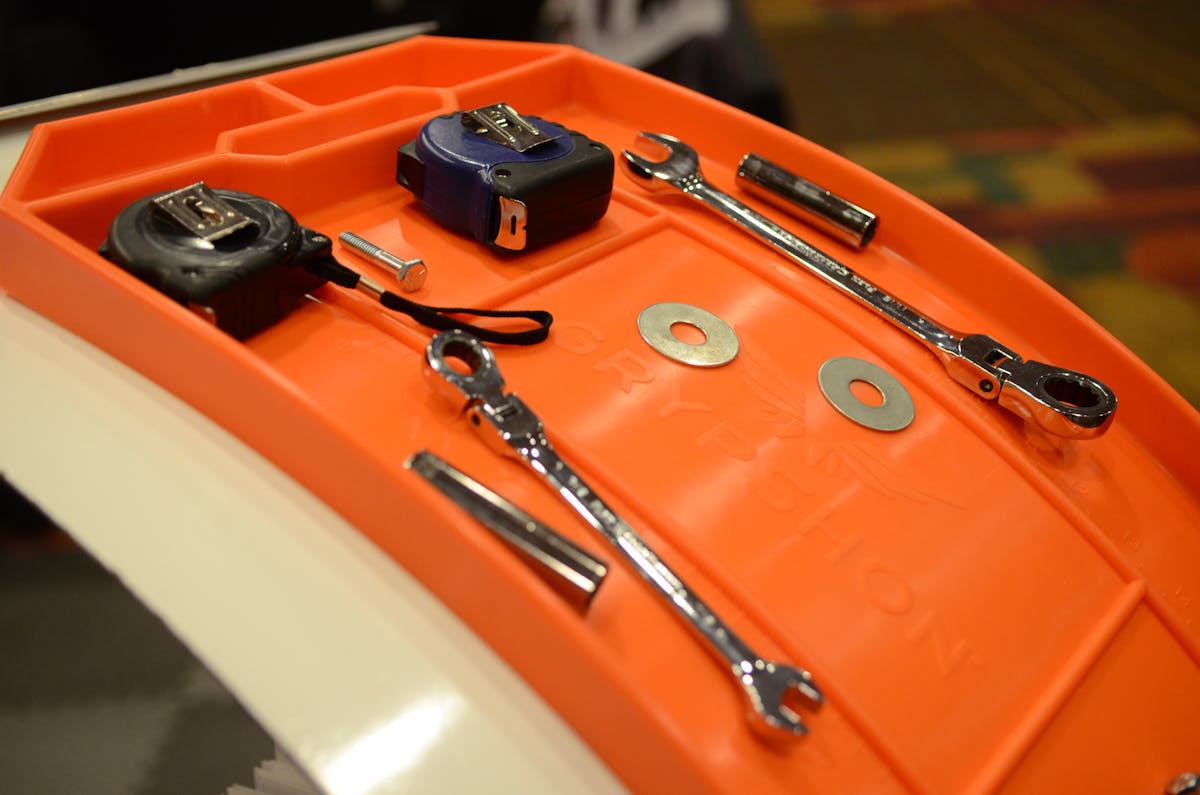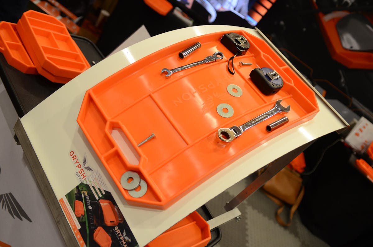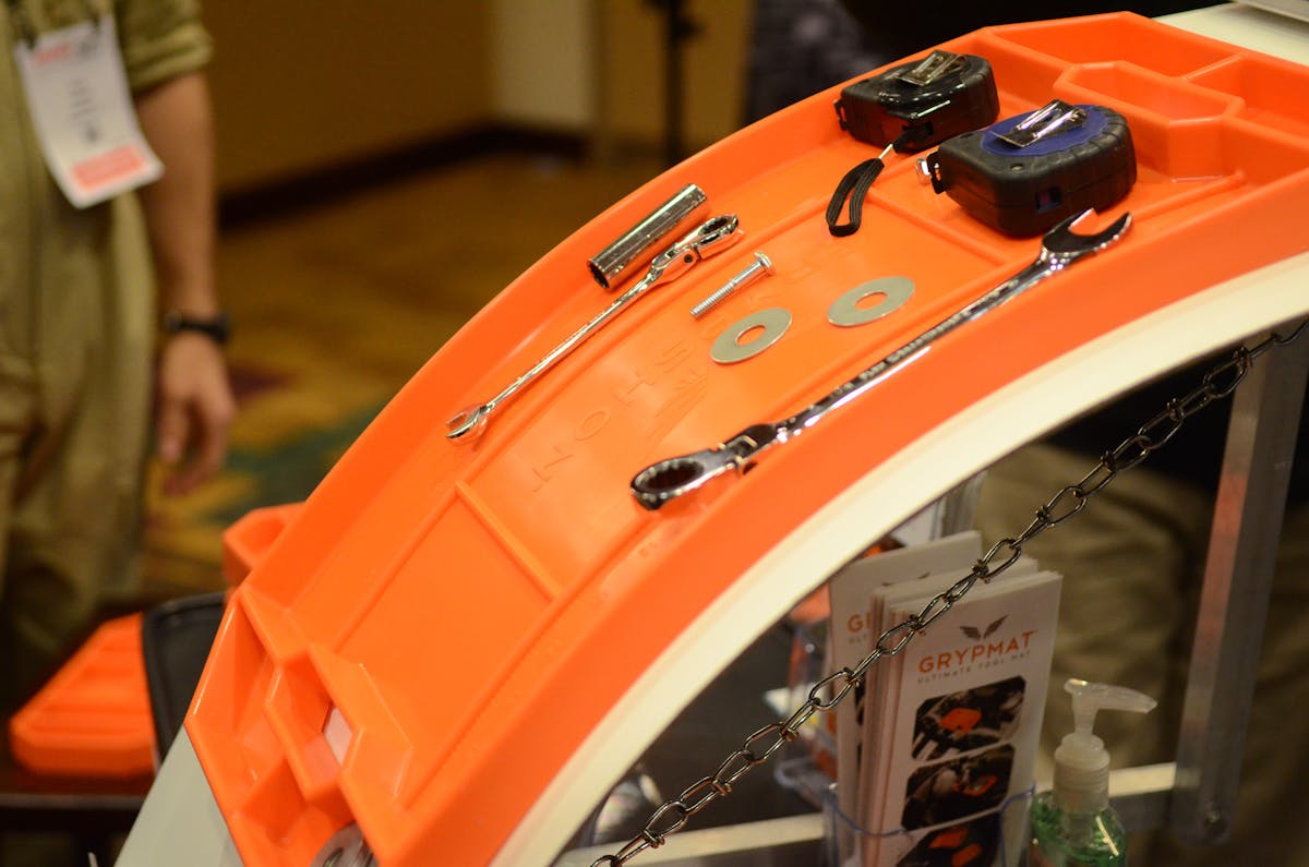 We first saw the Grypmat in a few NHRA professional pit areas this summer, where teams were able to lay the tray across their rounded scoops and all of their parts and pieces would remain right where they left them.