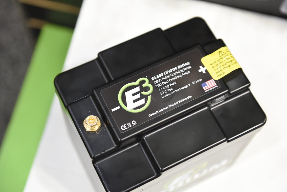 “These new batteries target racing applications. There’s small, medium, and large. The smallest, the SuperLite 800, has 840 cranking amps, 16 amp-hour capacity, and weighs just 4.5 pounds. The next one up is 1,200 cranking amps, 25 amp-hour capacity, and weighs 6.5 pounds. And the biggest one is 1,600 cranking amps, 32 amp-hour capacity, and weighs 9 pounds. So these batteries weigh roughly 80 percent less than their lead-acids counterparts, and that’s a massive weight savings,” says E3’s Rob Fisher.