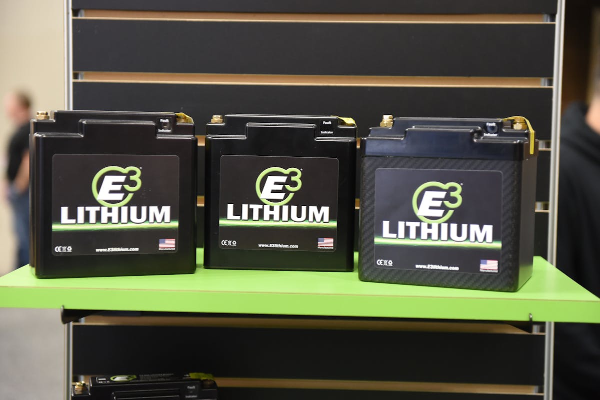 “These new batteries target racing applications. There’s small, medium, and large. The smallest, the SuperLite 800, has 840 cranking amps, 16 amp-hour capacity, and weighs just 4.5 pounds. The next one up is 1,200 cranking amps, 25 amp-hour capacity, and weighs 6.5 pounds. And the biggest one is 1,600 cranking amps, 32 amp-hour capacity, and weighs 9 pounds. So these batteries weigh roughly 80 percent less than their lead-acids counterparts, and that’s a massive weight savings,” says E3’s Rob Fisher.