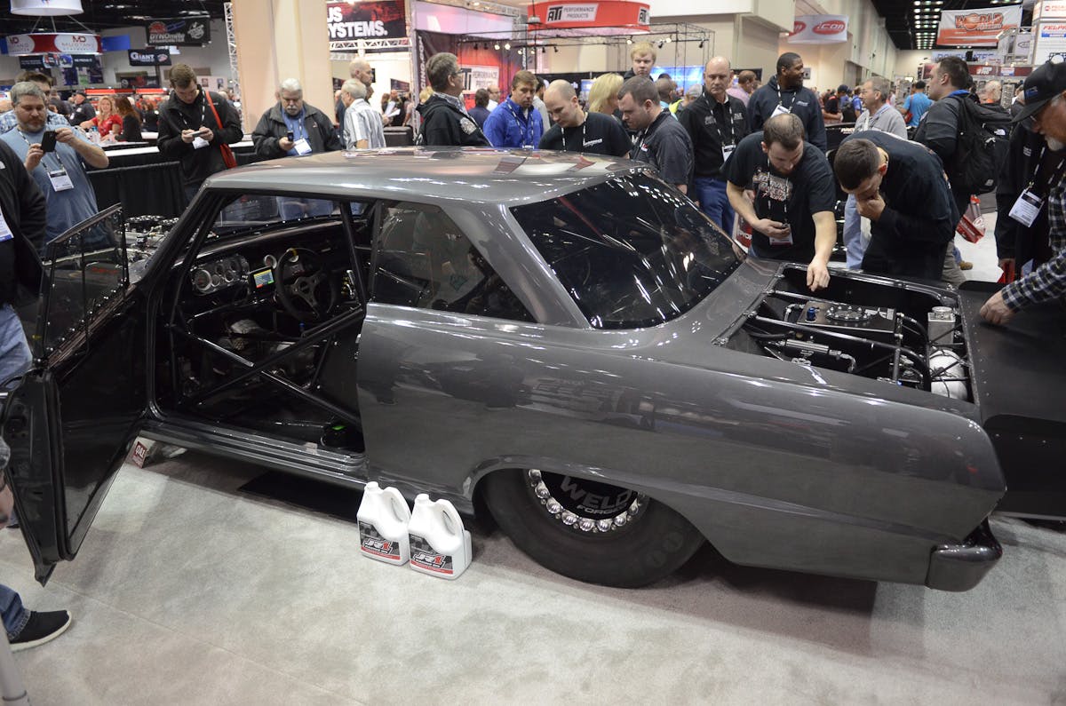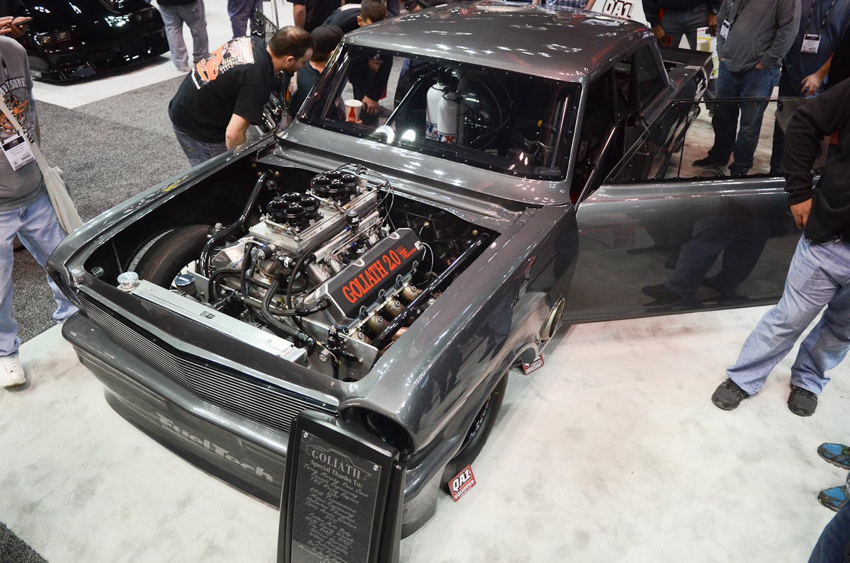 Just after the big unveiling of Justin “Big Chief” Shearer’s CrowMod to open the show, the mass of fans made an exodus a few rows down to the QA1 Precision Products booth, where “Daddy Dave” Comstock was all set to reveal his new ‘Goliath 2.0’ Chevy II — the replacement to the original ‘Goliath’ that was destroyed in a crash in Amarillo, Texas back in August.