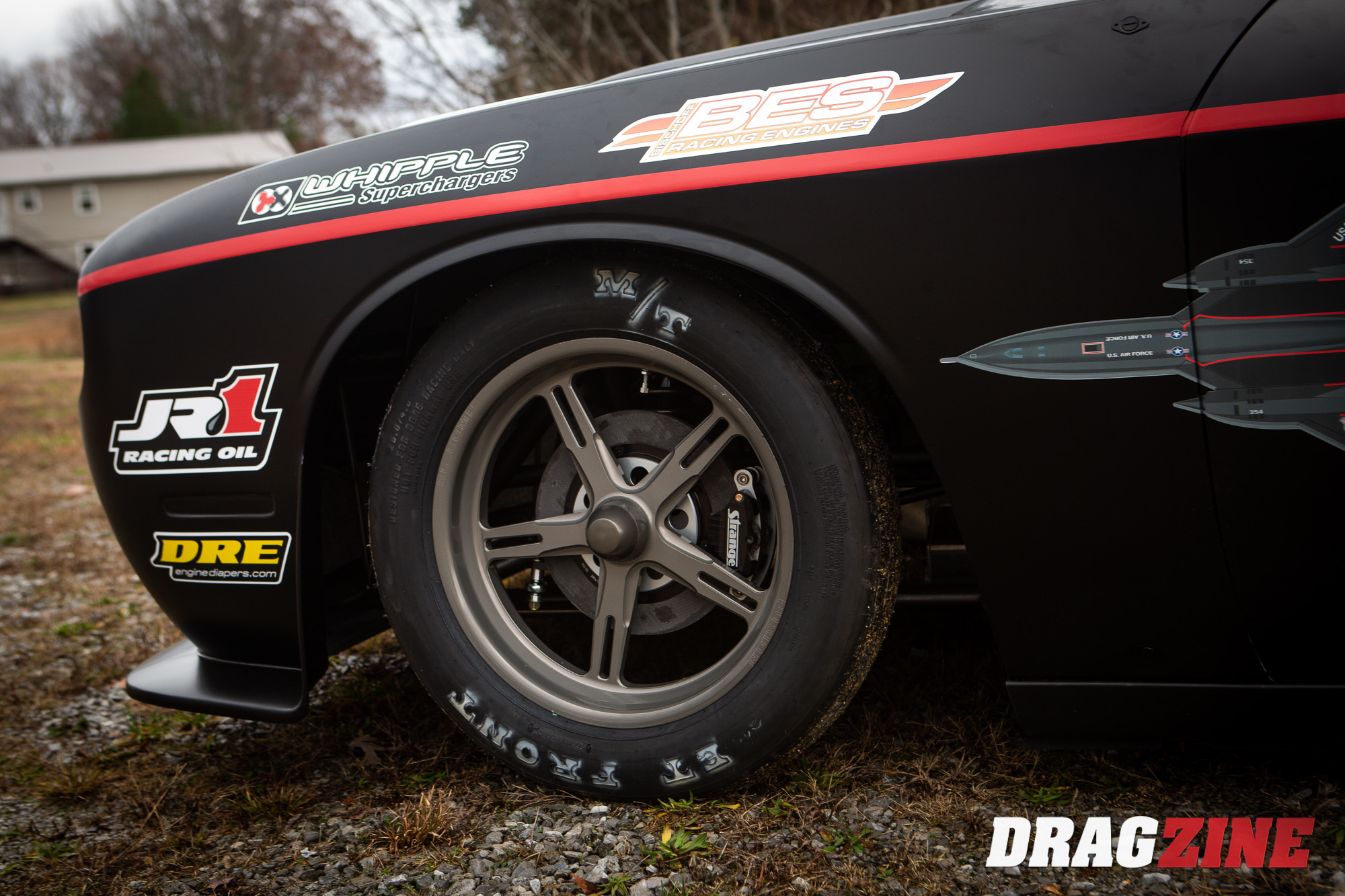 Turk’s Challenger will feature power from what is essentially a carbon copy of the aluminum HEMI that motivated his Drag Pak — a factory-built 354 cubic-inch mill that has been overbored to 364 inches and massaged to the nth degree by famed builder Tony Bischoff at BES Racing Engines. It’s topped with a 3.0-liter Whipple supercharger. This package, which has topped out over 1,500 horsepower on the engine dyno and is capable of exceeding 10,000 rpm, pushed Turk’s 3,500-plus-pound Drag Pak into the 7.50s, and this new FX car will tip the scales nearly 1,000 pounds lighter. The end result should run mid-sixes at over 200 mph on a 33×10.5W slick tire.