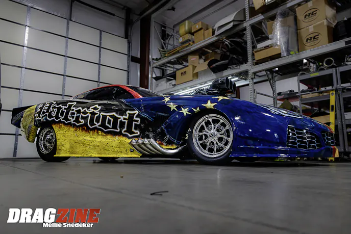 The Patriot is supported by Menscer Motorsports rear shocks and front struts, FuelTech, Hammer Concepts, Nitrous Express for the shifter and Ty-Drive, a Stroud parachute, a Strange Engineering modular Pro Mod rear end, and Strange Evolution brakes on both ends. BOHR supplied the titanium bellhousing, hat, and linkage. The car also features Race Star Wheels with spindle front mounts, custom zoomies, and an M&M converter.