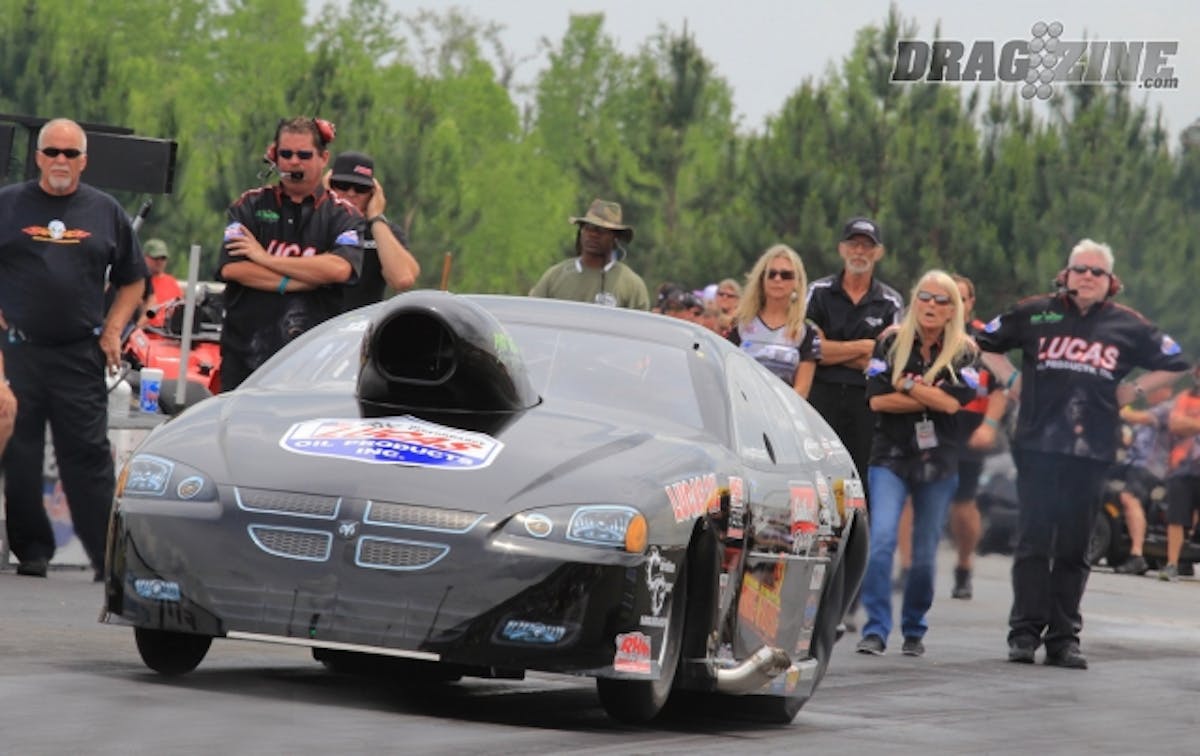 “Oh, it was bad. I was doing the last qualifying run, or maybe it was the one before the last. I had to try to get it started five times,” she said. “Finally it got started. The motor was heated up and actually, the car ran the fastest it ever has: a (3).79. I was so surprised.” She matched Tommy Franklin’s time but yielded the top-qualifying position with her 198.67-mph speed that was slightly slower than his 198.93.