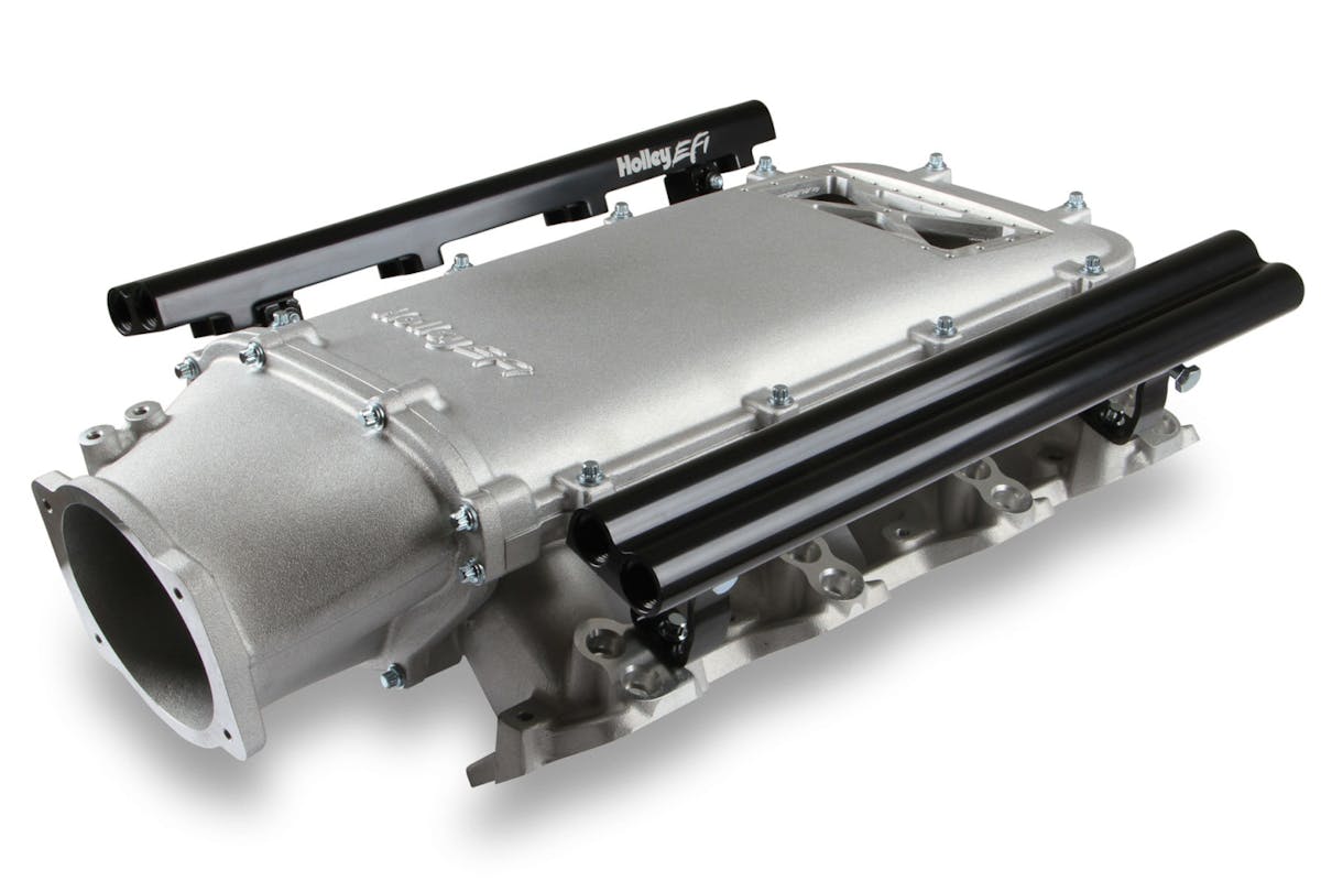 The Lo-Ram intake uses a front-feed design and has short runners with a low-profile base, this makes it the perfect fit for high-horsepower boosted applications. According to Holley, this intake works best with engines that make peak horsepower in the 7,000 to 8,000 RPM range. The Lo-Ram intake will be available in an as-cast satin finish or in a black powder-coated finish.