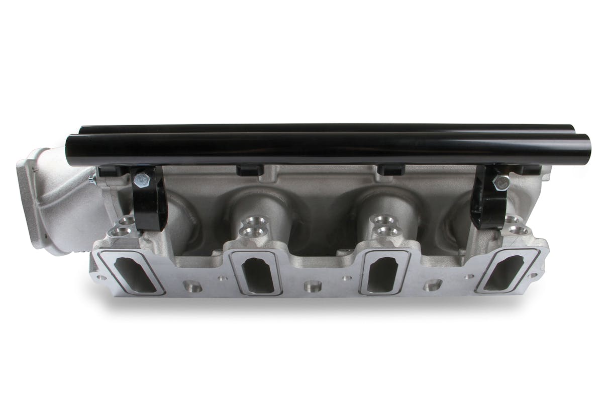The Lo-Ram intake uses a front-feed design and has short runners with a low-profile base, this makes it the perfect fit for high-horsepower boosted applications. According to Holley, this intake works best with engines that make peak horsepower in the 7,000 to 8,000 RPM range. The Lo-Ram intake will be available in an as-cast satin finish or in a black powder-coated finish.