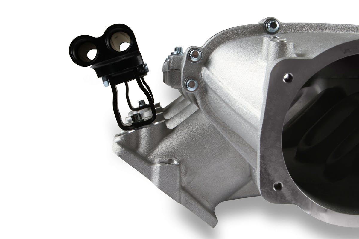 “The dual fuel injector LS Lo-Ram Front-Feed intake manifold was designed with forced induction, high horsepower, and under-hood clearance in mind. There is even a plenum top option that accommodates a burst plate. Having the ability to fit 16 injectors in a compact space really opens the door up for methanol, E85, and dual fuel configurations. Racers are already doing this, but now they have a manifold option that is ready to go out of the box and doesn’t require expensive fabrication work. The Lo-Ram top feed and Hi-Ram have already been a huge hit and this is another in a long line of racer-driven products.”