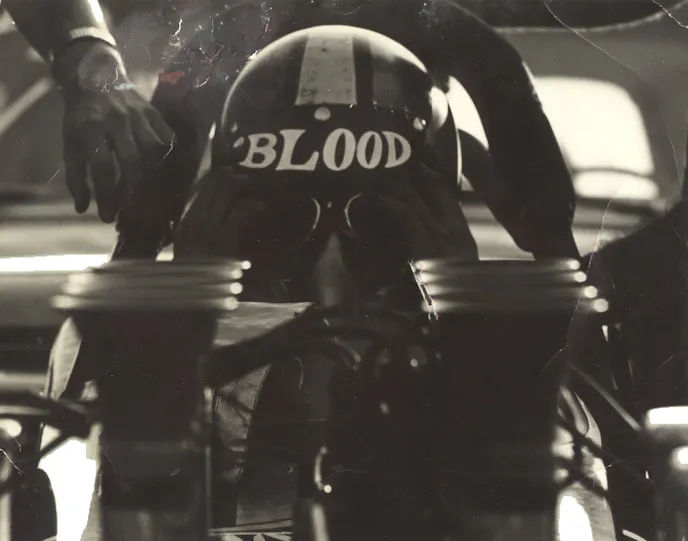 Kenny's first pinstripe job on the helmet and lettering job on his Go-Kart and the family’s ’55 Chevy in the garage.
