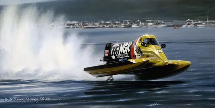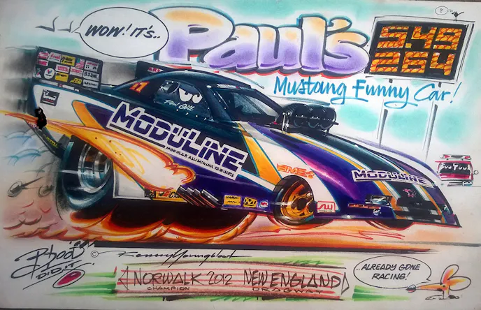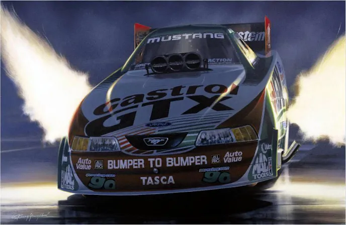 Kenny Youngblood is the artist who single-handedly started the race car art industry. Kenny first lettered cars and then designed and painted actual paint schemes on cars before spreading out into fine art representations of race cars and scenes. Kenny’s workmanship could be found on most  West Coast Funny Cars of the day, and as his reputation grew, he found himself traveling in every direction to paint racecars and even private street cars. Kenny’s work has decorated NASCAR and Indy cars and his paintings include Formula 1 and race boats, too. In addition, Kenny has owned and driven slingshot dragsters, managed off-road stadium racing teams, and even race boat teams.