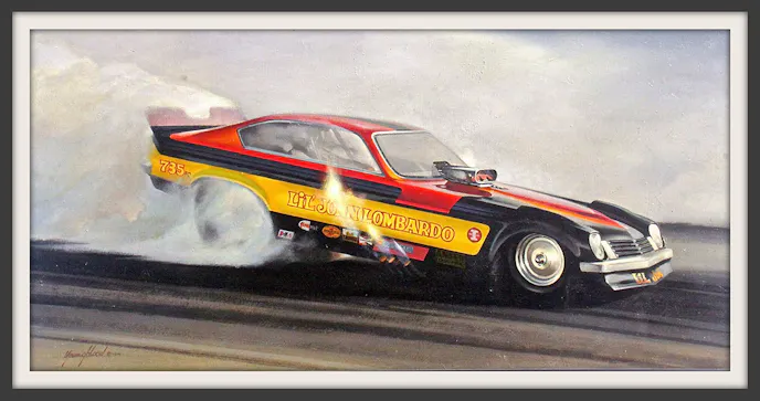 This never before published painting by Kenny Youngblood, depicts 70’s Funny Car star “Lil John” Lombardo, and his Vega Fuel Coupe.   Painted in the mid seventies and during the era of long, smoky burnouts, it depicts the car in the late afternoon, with smoke starting to fill the cockpit, just before John steps off the gas.