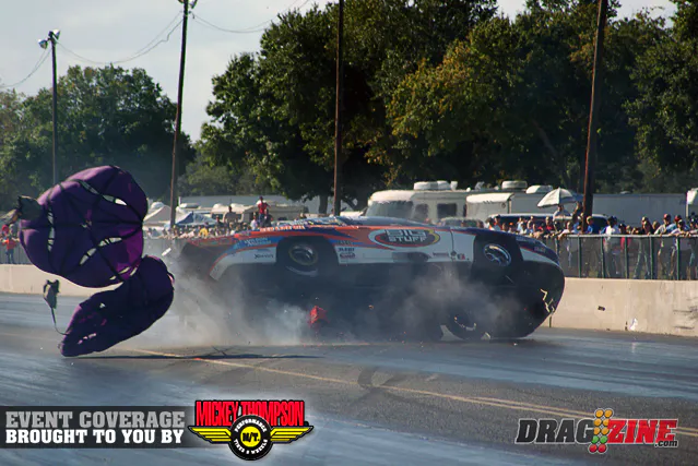 Moran: Yeah, I felt really bad when I saw it. I’d been through a lot of hairy moments with that car at 250 miles per hour. That car was only designed to run 205, and I ran 252 with it. Everytime I pulled the chutes, it’d lift the rear wheels three feet of the ground because the location of the pull point was great for Pro Stock racing, but it was too low for Pro Modified. It’d dance around on its nose guardrail to guardrail, but I always able to get it under control.