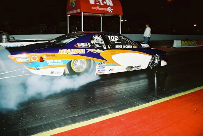After having his infamous quad-turbo big block and subsequent twin turbo big block engine combinations banned from competition right off the bat, Moran embarked on a new mission to reach the five-second zone with a new twin turbocharged ’99 Chevrolet Monte Carlo. After several hard fought years of single-handedly leading the turbo revolution, including lobbying for the inclusion of turbos in NHRA and IHRA Pro Modified, Moran achieved the landmark goal on March 12, 2009 with a 5.97 at 251 MPH in Valdosta, GA.