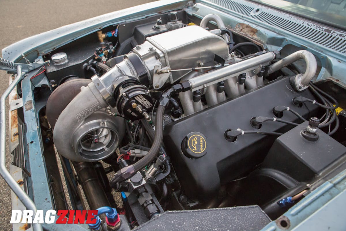 A Precision mid-frame 94mm turbo provides the boost, with Precision 44mm wastegates managing the boost levels. Radial tire racer Frank Soldridge fabricated the headers and the rest of the hot-side of the turbocharger system. On alcohol, it of course does not have an intercooler, and so Soldridge worked to keep the hot-side as short as possible to manage any heat concerns under the hood — a fact which is displayed well in the proven streetability of the car.