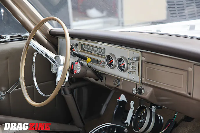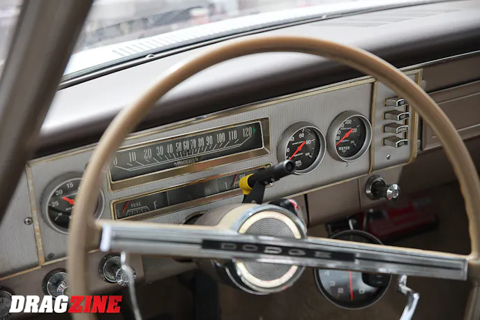 Inside, Langefeld also kept things tastefully simple, as he chose to add tan-toned Dodge A100 van seats up front to match the clean carpeting along with five-point harnesses. Next, he removed the rear bench seat entirely, wrapped the roll cage with matching upholstery both for comfort and aesthetics, and finally incorporated some essential AutoMeter gauges into the factory dash cluster.