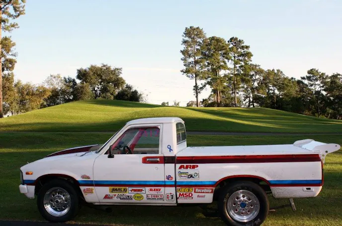 954520_576284629120584_590655959_nBut alas, there are other types of hybrids — ones far more pleasing to the typical wrench that doesn’t have a trunk full of batteries but does have a V-8 under the hood! To be honest, we didn’t really know what to label this week’s submission to Reader’s Rides by owner/driver Kevin Chatelain. Is it a Chevota or a Toyevy? Maybe it’s a Toy-ev-ord. While most modern day hybrids measure their success in volts/hours-per-linear-kilometer with the boredometer pegged at the red line, Kevin measures the performance of his 1980 Toyota pickup in horsepower-per-quarter-mile. Kevin obviously thought it would be a sly idea to have a lightweight import truck with a small block chevy stroked-out to 406 cubes that is backed it up with powerglide tranny. All that bowtie power is sent rearward to previously mentioned Ford 9-inch rear end which sports a 4.56 gear set.
