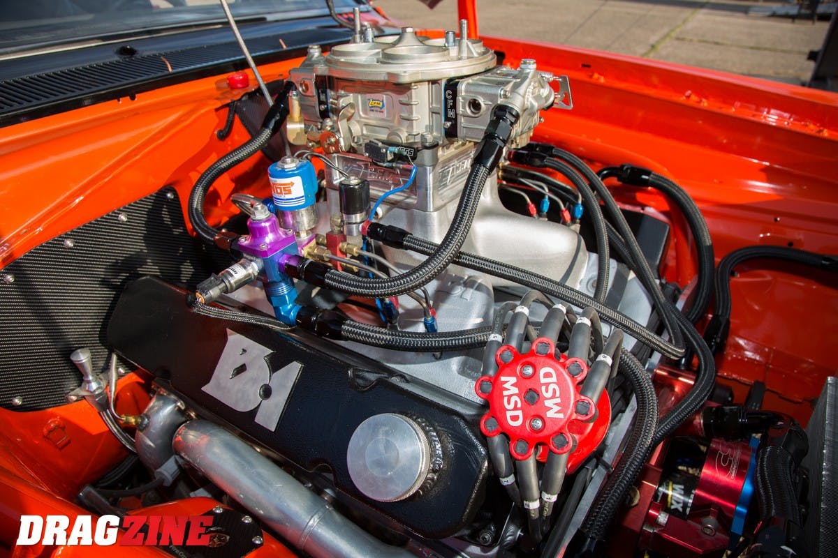 Bringing all of the air into the motor is a B1 intake manifold and CFM brand carburetor. To feed all of the race gas into the engine is a Magnafuel 500 electric fuel pump, while a Magnafuel regulator helps keep the fuel pressure where it needs to be. Providing the ignition for the motor is an MSD 7531 box, MSD coil, and MSD billet distributor. Billy tunes the motor himself with assistance from Coy Templeton.