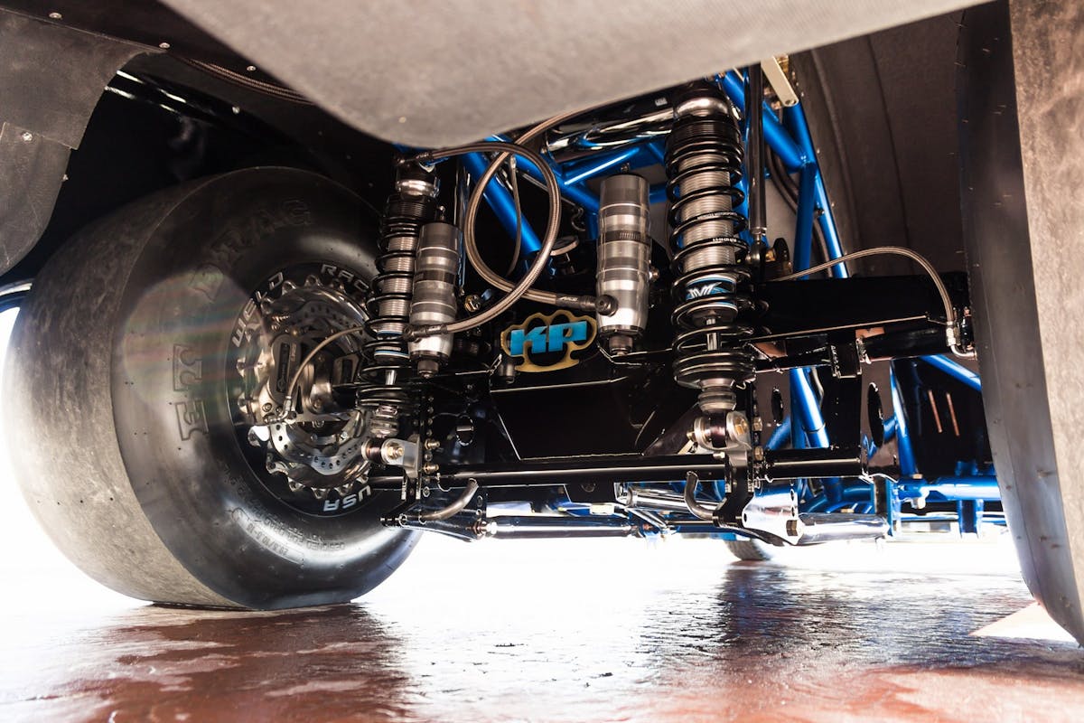 The Kingpin began life as a design at Goachers Street Legends before it went to Larson Race Cars to get a 23.5 chassis. The front underpinnings of the Nova consist of a Smith Racecraft bolt-in front subframe and Menscer Motorsports shocks. In the rear, Goacher created a suspension that is both a 4-link and ladder bar with two custom Moser Engineering rearends that can accommodate big or small tires. The rearend features a Mark Williams Enterprises third member and gun-drilled axles, while braking duties are handled by a full set of TBM Brakes.