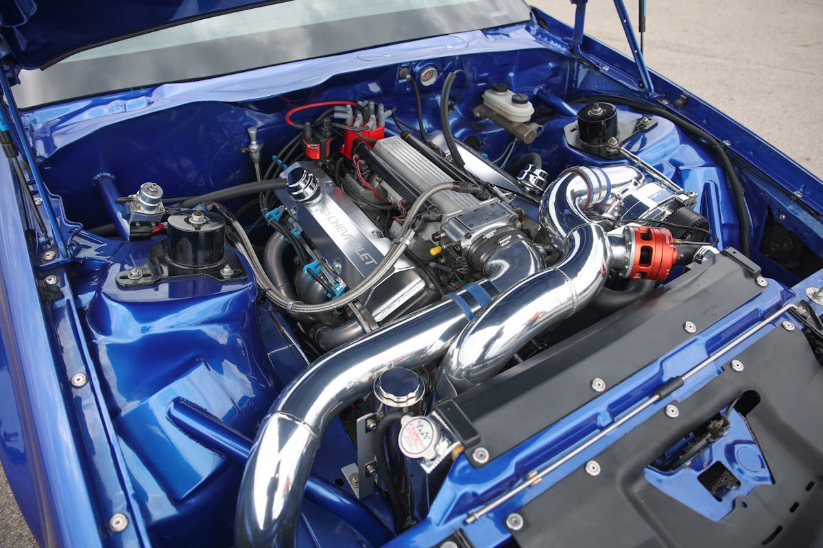 The induction system consists of a TPS mini ram intake and a Holley throttle body. A FAST ECU is the brains of the engine and is tuned by Sam. The ignition system is made of parts from MSD. Boosted air is fed into the small-block by a F-1 ProCharger head unit that’s been chilled by a ProCharger intercooler.