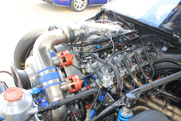 IMG_9875Board, an engineer by trade, utilizes a 406 cubic-inch small-block SB2.2 Chevrolet built by M&M Competition Engines in Indianapolis, built upon on a CN billet block topped with their Revolution cylinder heads that do away with the siamese cylinder design, making all eight pistons the same. A custom M&M intake and a Wilson Manifolds throttle body sit atop the cylinder heads. Board has fronted the powerplant with ProCharger’s potent F-3R-121 belt-driven supercharger, while a Holley EFI system serves as the brains of the fueling and ignition. The coil pack ignition often presents questions from onlookers about the engine being LS-based, but Board confirms it’s aways been an SBC. The dry sump oiling system (pump and tank) are sourced from Peterson Fluid Systems
