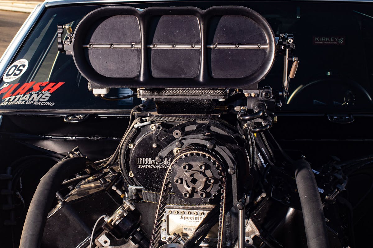 The Camaro is powered by a 521 cubic-inch Hemi that’s based on an Indy Maxx block. Inside the block is a Bryant crankshaft, MGP connecting rods, and Diamond pistons. A set of stock casting Chrysler heads with water jackets that are outfitted with a valvetrain from Ray Barton Racing Engines sit atop the cylinders. The supercharger of choice for Haug is a 14-71 unit from Littlefield and fueling is handled by a Waterman fuel pump. To keep the car cool while driving on the streets, Haug added a pair of radiators from a 1992 Honda Civic.