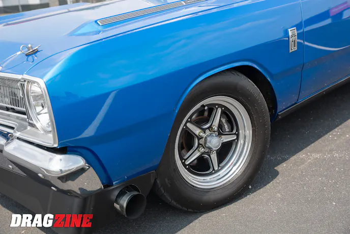 Finally, a set of 15-inch wheels were wrapped in Mickey Thompson rubber and bolted on to showcase the Wilwood disc brakes that had been installed up front as well as the factor Ford discs in the rear.