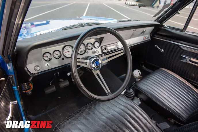 Next, he installed QA1 upper control arms along with QA1 front coilovers to work with the factory rear leaf springs which utilize an offset kit, then fitted a Ford Mustang II steering rack. Out back, a Ford 9-inch rearend with 3.55:1 gears has been beefed up with a spool and a set of axles from Moser.