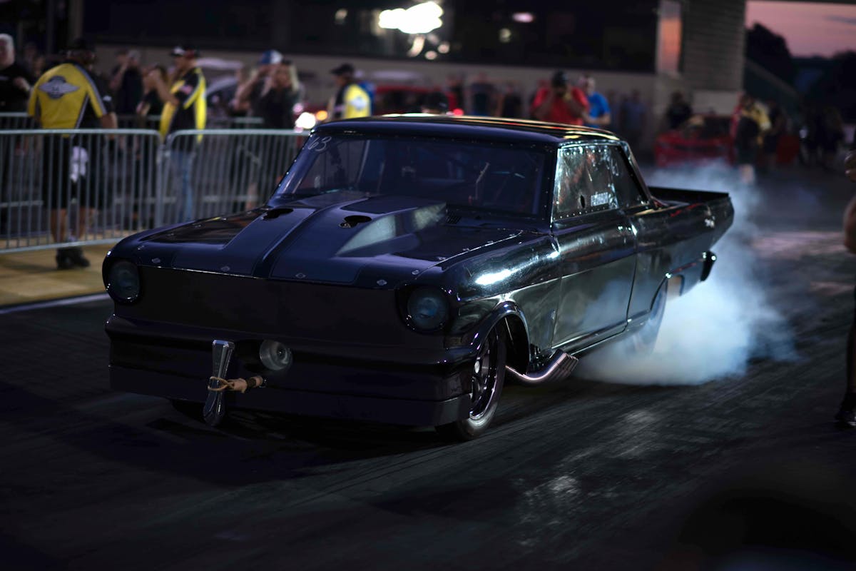 Around that same time he had noticed and gotten more into heads-up racing, and in those years (early 2000’s) 10.5W racing was the hot thing. So into the local 10.5W ring he went, and in short order proved he was competitive as a racer. “I raced [in it] until I got to where I could outrun everybody that showed up with 10.5W’s,” Larry says. And to win with consistency in that series was particularly improbable. As he explains, “The tracks that we raced on were just crap. I mean I hate to say that but it was back-woods… some of the worst tracks in Virginia.” But all throughout that, “We always heard about all these ‘fast’ cars, in North Carolina,” he recalls, “And about how everybody had these fast cars in North Carolina.” So, when he first put together the car in which he really began to build his reputation, a black 1964 Chevy II intended specifically for no-time grudge racing, with a big screw-blower through the hood and 275 drag radials at the back, he of course went down to the Carolinas to test his mettle. And it wasn’t long before he showed himself, and quite a few others, that he was more than capable of passing that test.