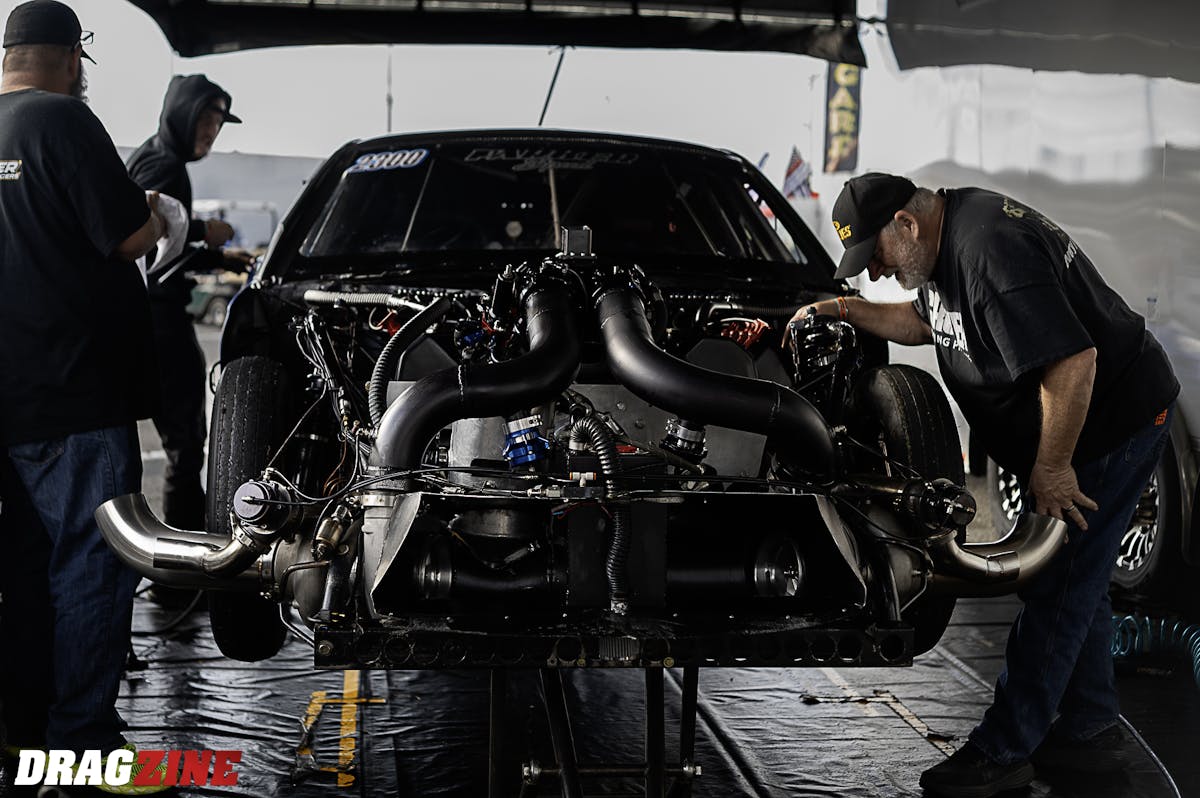 The weather at Lights Out 16 was wild to say the least and no team had data for the DA readings they were seeing. Brad’s first test pass was a 3.83 at 187 mph, clicking the car off early and coasting across the finish line. At that point, Brad knew they had things figured out. Brad decided to make a full test pass with a lazy 60-foot tune up and the Mustang went 3.73, at that point he knew it was game on.