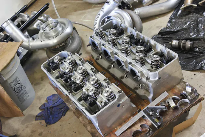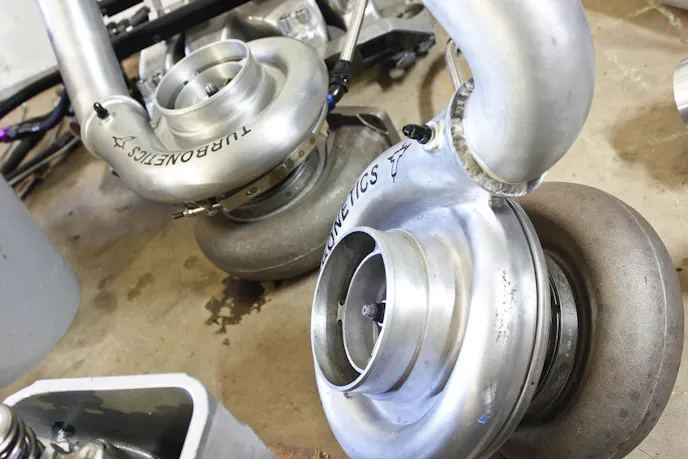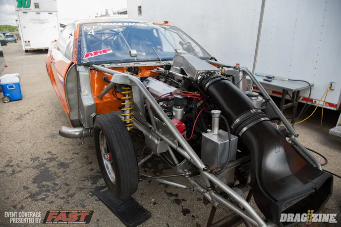 The car now has Haltech engine management system that controls the fuel injection, as well as all of the cdi ignition duties. The system uses Fuel Injection Development injectors that are fed methanol at 100 psi by a belt-driven Aeromotive fuel pump. In place of the nitrous oxide combination Street Outlaws viewers are familiar with, it also now feature twin Turbonetics 88mm turbos, with the boost is controlled by Turbosmart wastegates and blowoff valves. All of the headers and piping were completed by Woods himself, and all flanges and piping came from Woolf Aircraft Products.