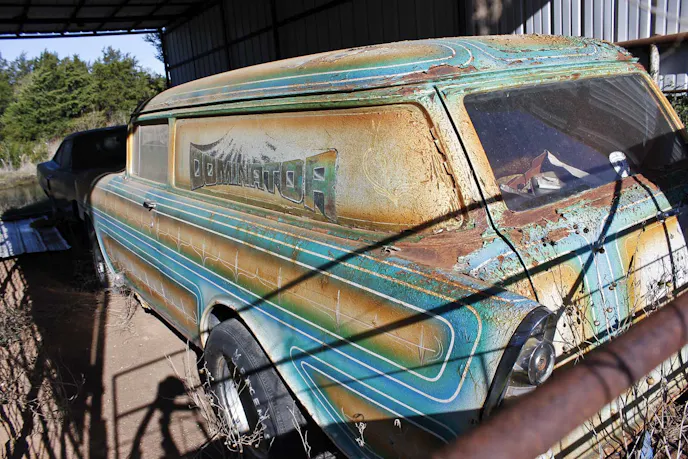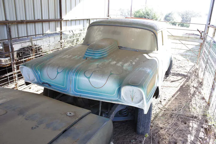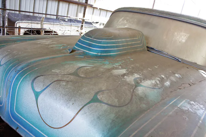 One particular car in his collection jumped out at us. It might have been because it came from an amazing period in custom cars, or it might be the patina, or perhaps it was the mural emblazoned on its doors.