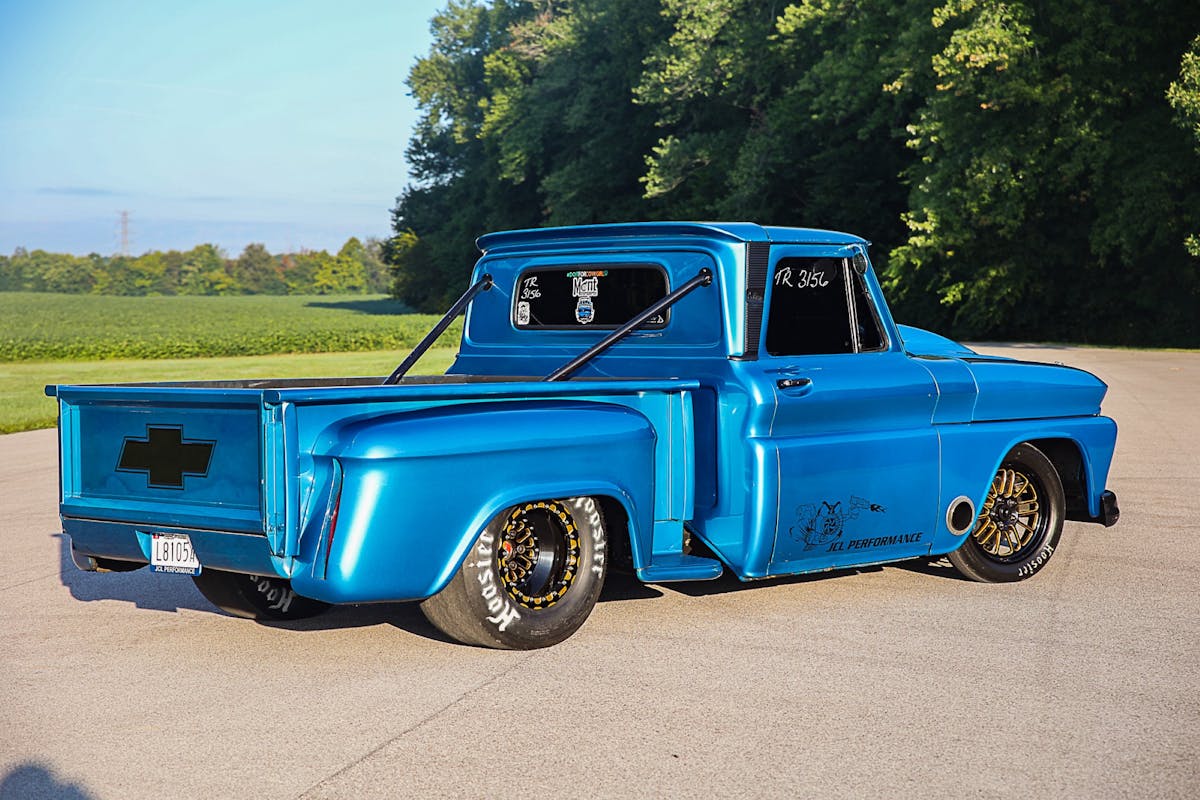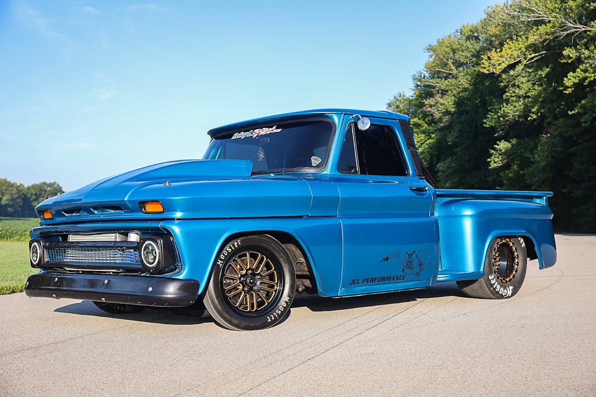 Instead of using a HEMI to power his gasser, Larson opted to build a 541 cubic-inch Chrysler Wedge engine. Clegg Engine & Machine got the block ready for the SCAT crankshaft, SCAT rods, and Icon pistons to be dropped in. A set of Trick Flow aluminum heads and INDY tunnel ram intake top off the engine. Larson used valve train parts from Howard’s Cams. A pair of Edelbrock AVS-2 650 CFM carburetors bring air into the engine and mix it with fuel that’s pumped in by an Aeromotive fuel pump. Larson made the fender exit headers that expel the exhaust gasses himself.
