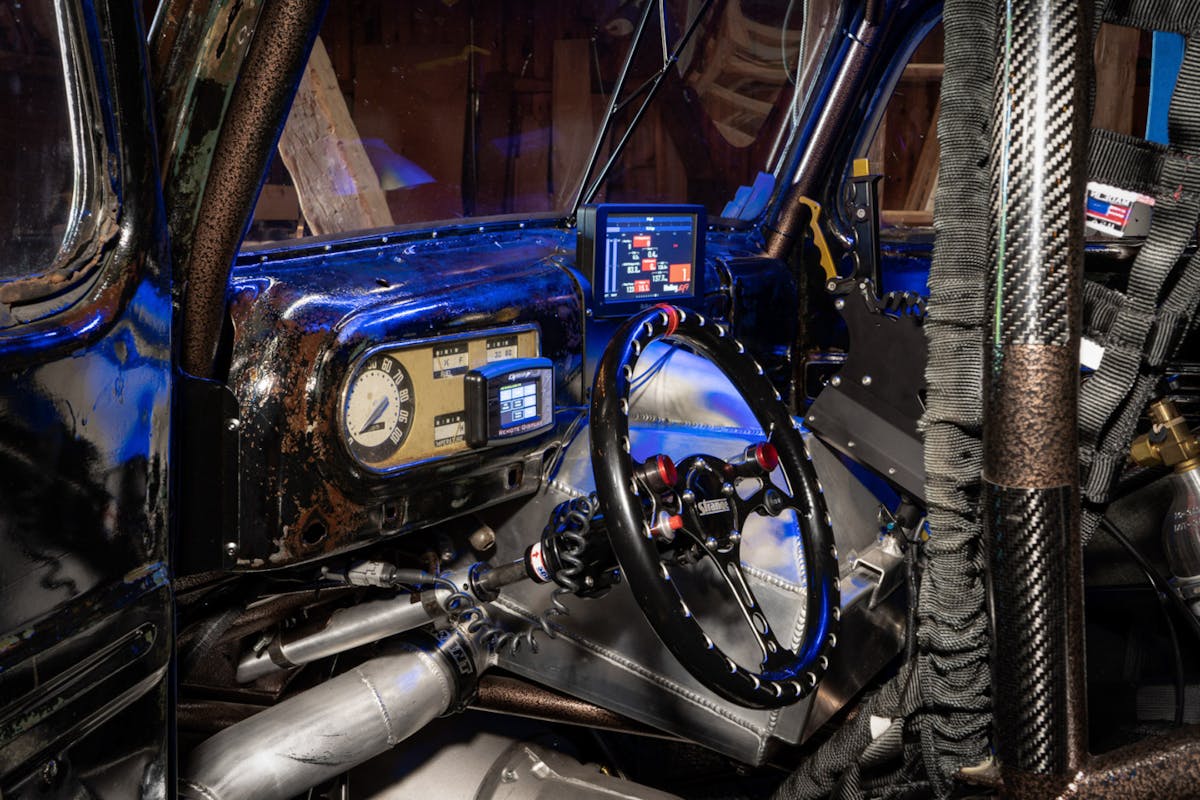The classic Ford was taken to Joe Piraino at Piranha Fabrications so it could be transformed into a fun turbo street truck for Caden to drive. Well, that plan went off the rails and the truck really went under the knife in a big way. The final product is what you see — a 25.2 chassis steel-body truck that’s set up for small-tire no-prep racing. Frank Perrin sprayed the clear coat over the truck’s patina to give it a unique look.