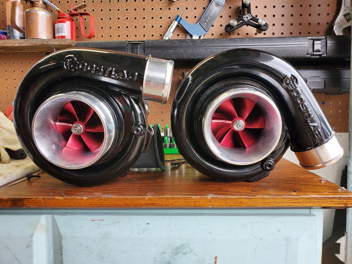 Kesatie utilized a factory “BGE” Demon cast-iron block — unsleeved and with stock main caps and all — and outfitted it with a factory Demon crankshaft, custom CP pistons, Gearheads’ head stud upgrade, Thitek raised-port aluminum cylinder heads with inconel valves, dual springs, stock rocker arms, an upgraded rocker arm girdle, and a custom-spec’ed camshaft. A Plazmaman billet aluminum intake manifold and ID.2000 injectors deliver the air and One R (ethanol) fuel in concert with BoostLab billet-wheel, air-to-air intercooled 7675 turbos. Kesatie relies on a Holley Dominator EFI/ECU system and Holley digital dash to manage the combination.