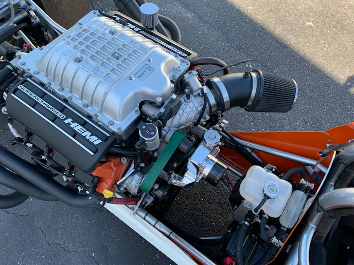 Better Built installed MAHLE forged pistons, Carillo rods, and ARP bolts to the factory crank to strengthen up the bottom-end, maintaining all stock specifications (factory 6.2 bore and stroke). Scheid bought a factory supercharger from a 2016 Dodge SRT Hellcat to put on it, and likewise bolted the bone-stock cylinder heads back on.