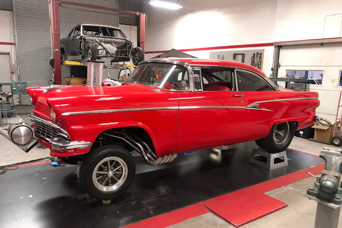 “A fella’ in Kansas built the car, and a guy out of Missouri built the motor. It was sold to a guy in Tennessee and then I bought it from him,” the 72-year-old Shields shares. “My son had sent me a picture of this car two of three years before I bought it, and he said this was the best-looking Ford he’d ever seen stance-wise. I told him, ‘I think you’re right.’ I was buying one of Tony Christian’s 57 Chevrolets from this guy in Tennessee and asked him if he happened to have a ’56 Ford gasser. He said, ‘yeah, I’ve got that car.’ So I flew back to Tennessee and bought the red ’57 and this ’56 from him.”