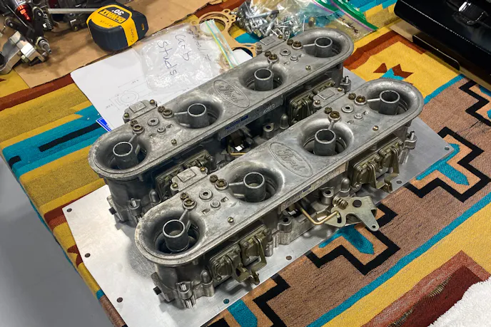 “Back in the late 1960s and early ‘70s, when everybody was doing Trans Am racing with the Boss 302, they were all running cross-ram manifolds with two four-barrels that were staggered. Trans Am outlawed those carburetors, so Ford went and built an inline Autolite carburetor that was two four-barrels in a row. Those were outlawed by Trans Am, then by NHRA and NASCAR. There were about 350 to 400 of these built — there were large and small ones. I’ve got four of them, and a buddy of mine has one,” Shields tells us.