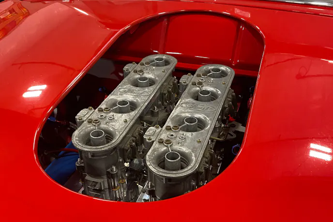 “Back in the late 1960s and early ‘70s, when everybody was doing Trans Am racing with the Boss 302, they were all running cross-ram manifolds with two four-barrels that were staggered. Trans Am outlawed those carburetors, so Ford went and built an inline Autolite carburetor that was two four-barrels in a row. Those were outlawed by Trans Am, then by NHRA and NASCAR. There were about 350 to 400 of these built — there were large and small ones. I’ve got four of them, and a buddy of mine has one,” Shields tells us.