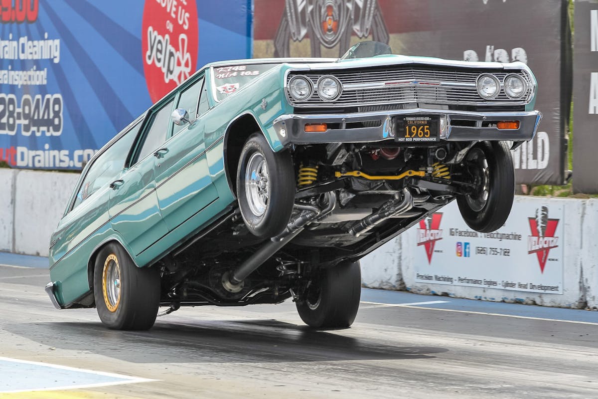Other than the roll cage, the chassis is all ’65-era GM. Mike has since added Racecraft front control arms with QA1 coilover shocks, and the stock factory four-link has also been beefed up with QA1 control arms and coilover shocks. PMR Race Cars in California also built him a custom set of wheelie bars.