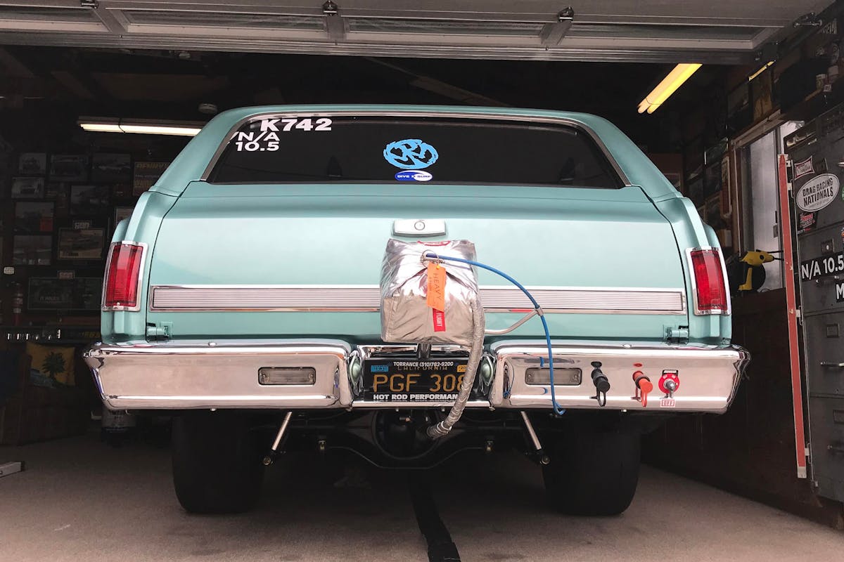 Other than the roll cage, the chassis is all ’65-era GM. Mike has since added Racecraft front control arms with QA1 coilover shocks, and the stock factory four-link has also been beefed up with QA1 control arms and coilover shocks. PMR Race Cars in California also built him a custom set of wheelie bars.