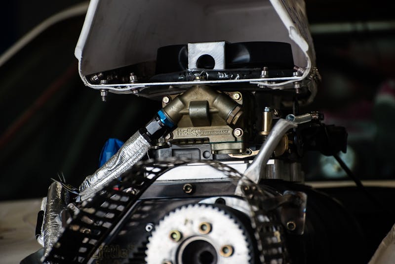 “I started drag racing in 1964 with a 421 Grand Prix Pontiac and progressed on up there with Chevelles and Corvettes and so on up through 1970. Got out of that in ’70 and went snowmobile racing. I did that for quite a few years and also go kart racing. And then I got into late model modifieds on dirt and then went to straight modifieds on dirt. Then I’ve gone to asphalt and then got into tractor pulling full tilt. Probably in 2012 I gave up tractor pulling. It was a lot of work back and forth across the country, and the tractor was getting out-dated. I knew I had to do something different. My son called me up one day — we’re a Ford dealer — and he said, ‘We’ve got a chance to get a Super Cobra Jet.’ That was in 2013. I said, ‘Well, put my name on a white one.’ And that’s how my drag racing started back up again. I hadn’t been in a drag car since 1970 and here I am jumping back into it at 70-something years of age.”