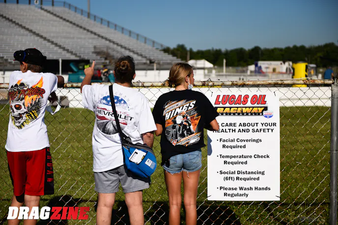 The current status is that the venue, a mainstay on the Mello Yello Drag Racing Series tour, is under a temporary restraining order that limits fans to 175 “per activity area” (which can be grandstand segments, the pits, and food areas, all of which must be at least 50 feet apart).