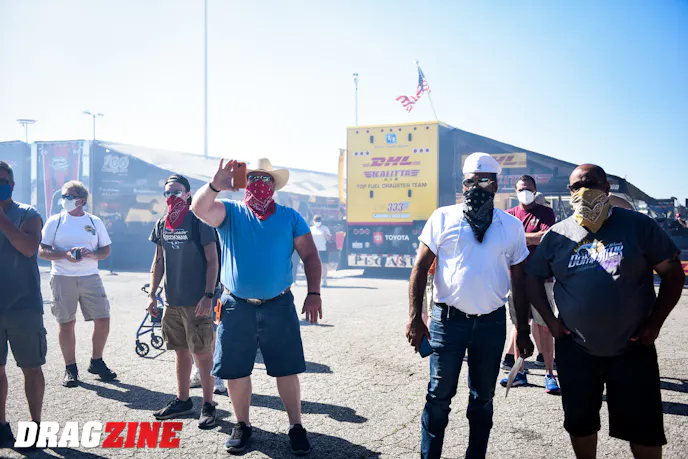 About 75 pro racers were at the first Indianapolis race, but the one driver everyone talked about the most was one who wasn’t even there: Funny Car’s John Force – along with Brittany Force, Austin Prock, and Robert Hight. Other racers opted out of the restarts, notably Mike Salinas, Scott Palmer, Cameron Ferré, and Pat Dakin.