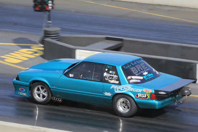 At the Mooresville Dragway in October, Pearson rolled to a race-winning 4.169 at 173 miles per hour, with an otherworldly 1.03 short time. Pearson’s Fox body Mustang, with power from a 400 cubic inch small block Ford fed by a ProCharger F-3A-121 supercharger, could’ve easily qualified in the top half of any Radial versus The World or Radial Wars field in the country — with a tire nearly two inches narrower in tread width – with that run.
