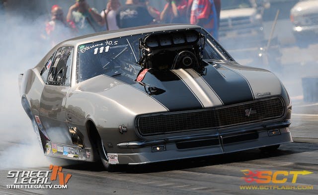 If one does some unscientific math, it’s clear that – given the engines and technology that are currently available – the nitrous racers in this category are fighting an uphill battle without a peak. Sheikh Khalid Al-Thani holds the current, unofficial record for a screw-blown Hemi at 3.63 seconds; a combination very much like that of Ulsch’s Camaro. Ulsch has been as quick as 3.92, and most onlookers and keyboard crew chiefs agree that it’s perfectly capable of mid to low 3.8-second laps. Score roughly two-tenths for the big tire over the 10.5W. So, taking that into account, the quickest Pro Nitrous lap with the monster cubic inch engines is 3.81 seconds. Even if bolted into the framerails of Glidden’s Mustang or Jeff Paulk’s Camaro, it can be surmised that they still couldn’t hang with Pappas’ 3.88 record.