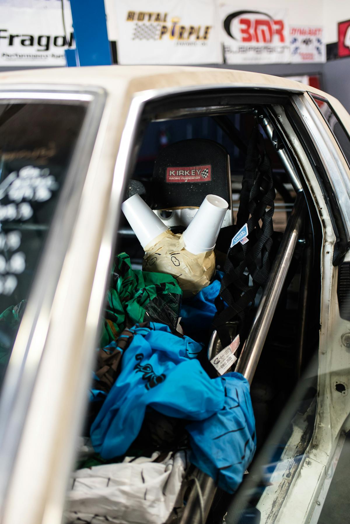 Driver Jay Boddie will be held tightly in a used Kirkey circle track seat with a Summit racing harness. A Stroud window net will keep him inside the cockpit in the event of a crash, and a Summit transmission blanket will keep him safe in the seat.