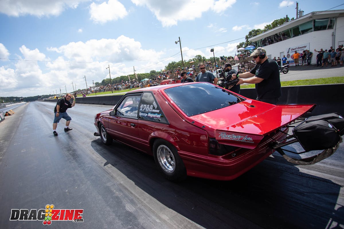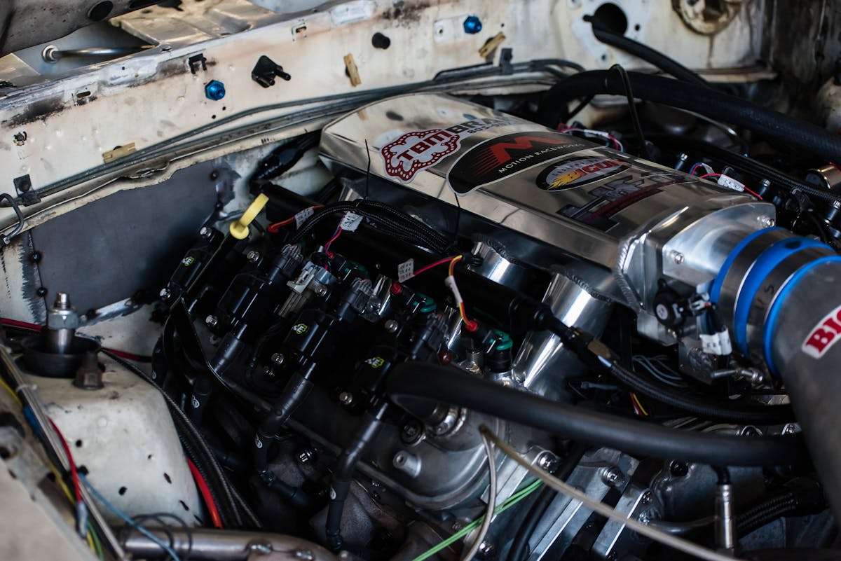 The driver’s compartment of the ‘Stang received a Summit Racing safety harness, Kirkey aluminum seat, and Stroud Safety supplied window net. The guys found a used Cheetah shifter and Grant steering wheel to put in driver Lyle Barnett’s hands. Summit offered their own brand of roll bar padding and transmission blankets as a part of the supplied safety equipment. Finally, a Summit Racing engine diaper kit made sure the engine bits didn’t spill over the track in case of an emergency.